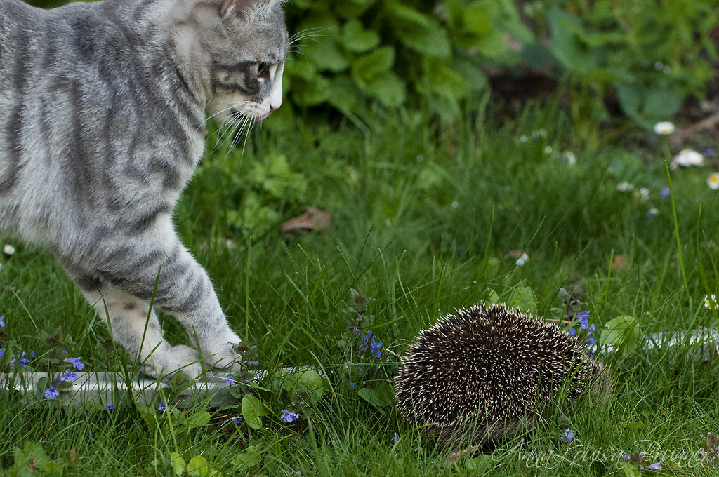 4. Schöner Schnappschuss! Meistens passiert ja nichts und sie schauen sich den Igel nur ganz genau an. Die Katze hat den Igel ja richtig im Blick!