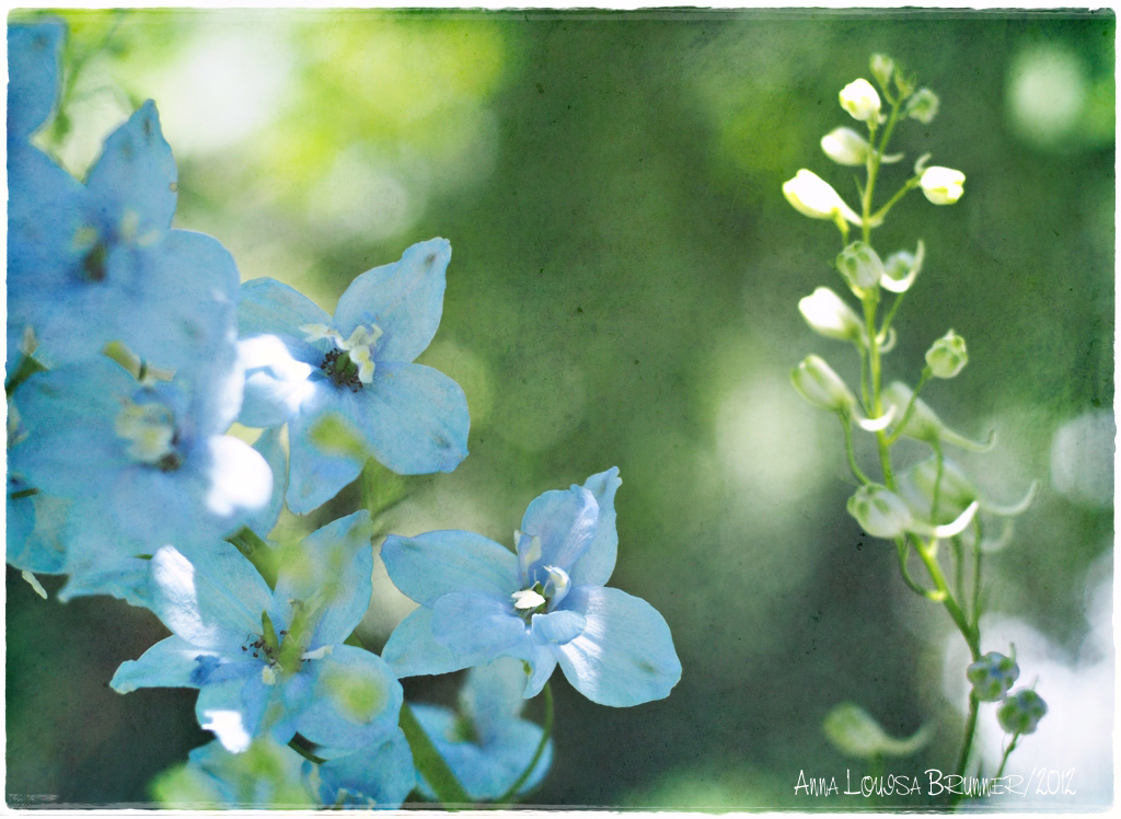 Ganz besonders schöne Seiten des Sommers sind ohne Zweifel die vielen Gärten in denen es grünt und blüht nach Herzenslust. Eines der wenigen Blütengewächse in MEINEM Garten ist heuer der blaue Rittersporn, den ich hier im Bild verewigt und mit einer Textur unterlegt habe.