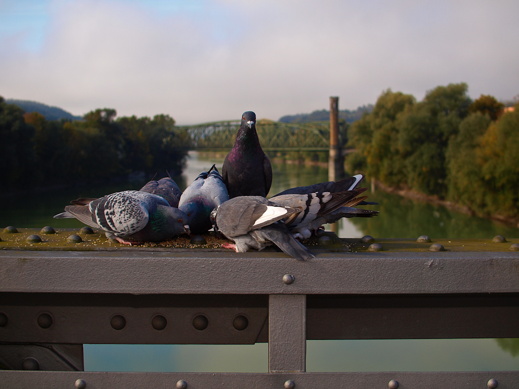Tauben beim Frühstück hab ich hier vor ner Weile in Passau auf dem Fünferlsteg beobachtet 🙂