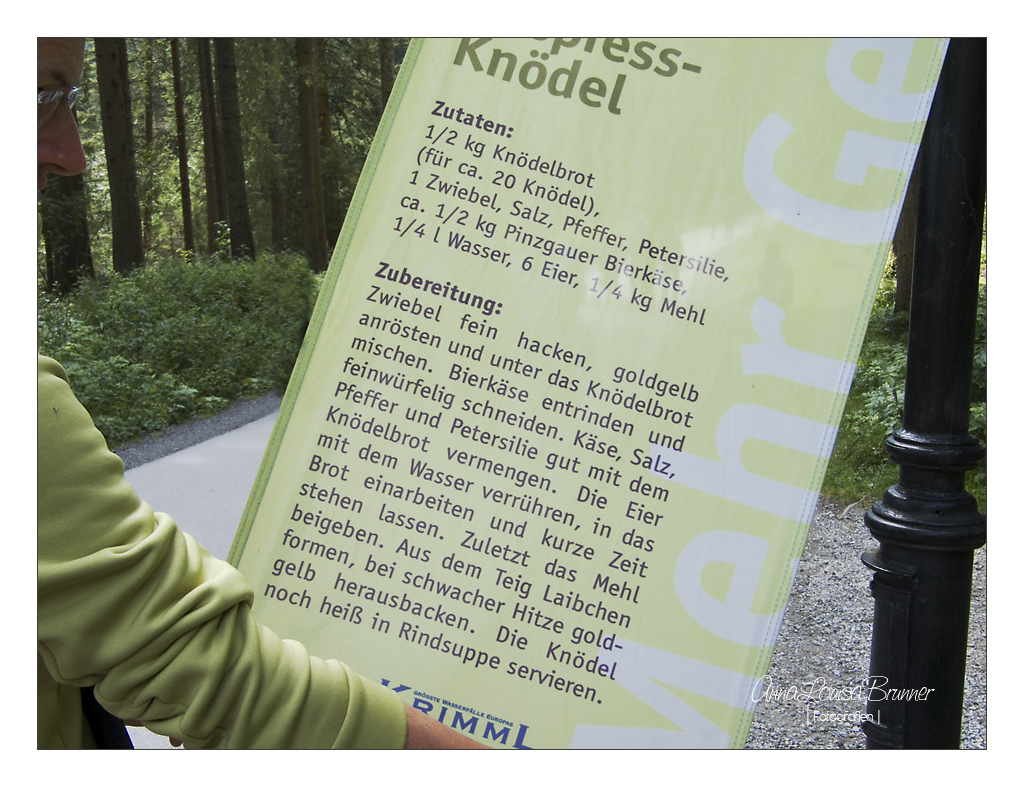 Das war jetzt aber gar nicht so einfach etwas mit der Farbe „hellgrün“ zu finden. Normales Grün ok… das gibts ja wirklich überall, aber h e l l g r ü n??? Naja, ich bin jetzt doch zufällig in meinem Archiv fündig geworden. Ein Bild von vor zwei Jahren bei einem Besuch der Krimmler Wasserfälle. Ihr könnt die Knödel mal nachkochen, sie schmecken sehr gut. Ein typisches Gericht der Pinzgauer Küche. Dieser „Zinken“ da am linken Bildrand ist übrigens meiner – mein Bruder behauptet seit zig Jahren, dass – wenn man mich mit der Nase in einen Baum schlagen würde, ich aufrecht stehend schlafen könnte…. Ganz schön gemein gell! 🙂